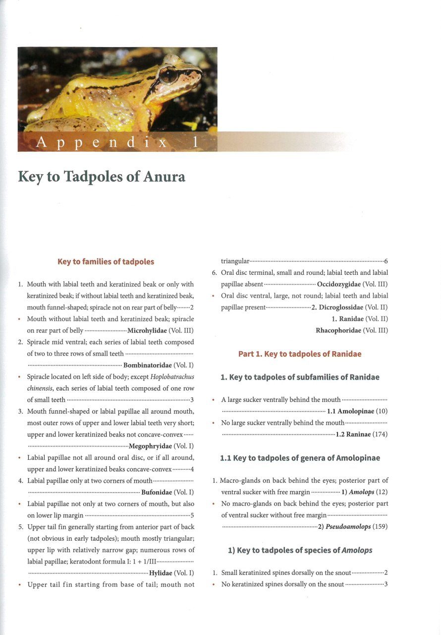 The main part is a continuation of the taxonomic coverage of the order Anura that started in volume 1, and covers two families (Ranidae and Dicroglossidae), five subfamilies, 34 genera, and 187 species and subspecies. It is accompanied by approximately 3200 images.