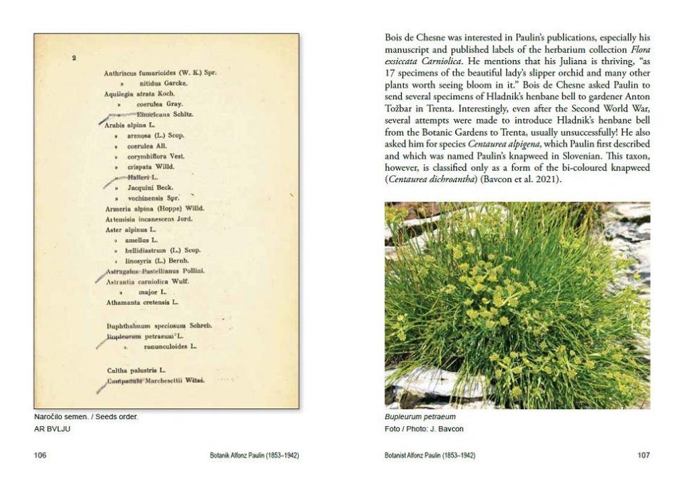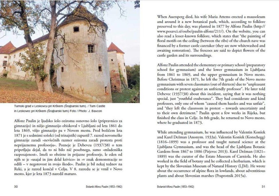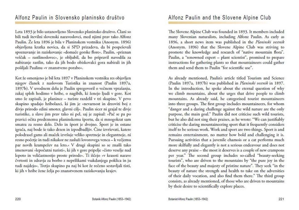 In this monograph, the authors have analysed the work of Slovenian botanist Alfonz Paulin, who made a significant contribution to the development of Slovenian botany at the turn of the last century. He wrote the first original textbook on botany and thus helped develop Slovenian terminology. He was a high school professor and lectured on botany at the then newly founded university. While analysing the flora, he found that the knowledge of plants in Slovenia needed to be supplemented and created his largest and most important scientific contribution: the herbarium collection Flora exsiccata Carniolica, which is the cornerstone for the further development of floristics in Slovenia. In addition, for many years he led its oldest botanical institution – the Botanical Garden, which, with his work, raised it to the European level and established numerous connections with other gardens in Europe.