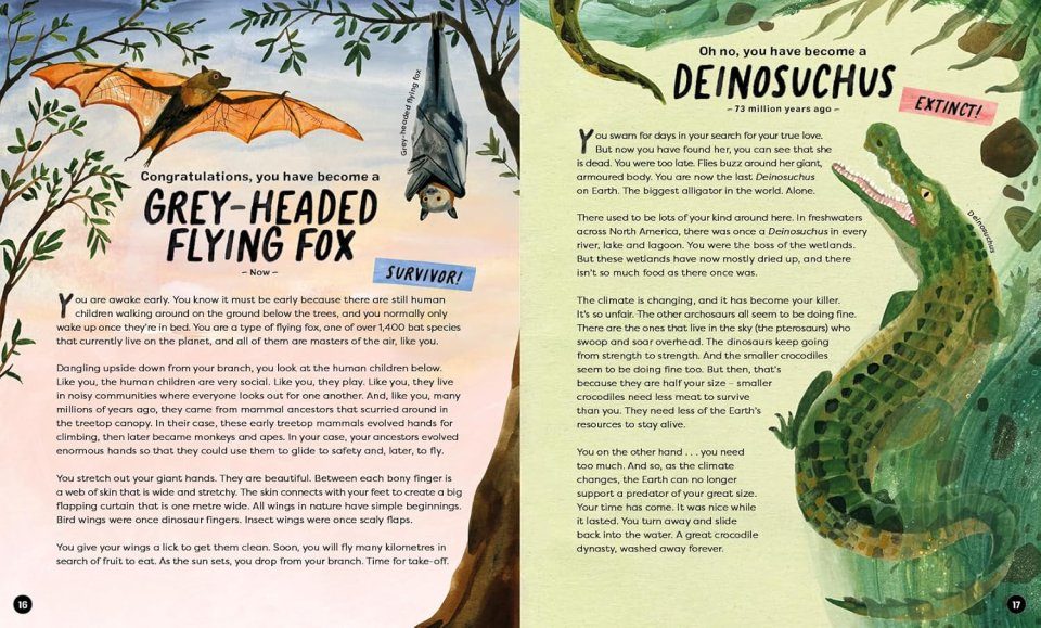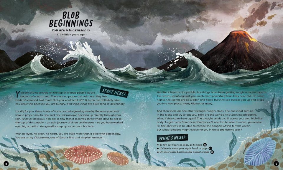 Think of an animal, any animal at all. It could be a shark, a squid, a snail, or even a human like you! Every single animal has a secret history. A death-defying adventure that has happened across millions of years, called evolution. On every page, you will discover a new animal with its own exciting story to tell. It's up to YOU to make the decisions that will lead to their next evolutionary step. Can you survive to the present-day or will you face extinction along the way? Will you grow a backbone, take to the skies, or dive deeper for your dinner? For the first time ever, the journey is in your hands . . .