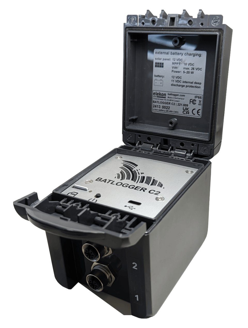 The Batlogger C2 from Elekon is a passive full-spectrum bat detector featuring two microphone channels. Designed for long-term monitoring, it features a built-in 20.4Ah battery capable of recording for 330 hours, with external power options also compatible for even longer durations. The C2 works alongside the BATLOGGER Control App, available on Android® or iOS® devices with Bluetooth® Low Energy, for quick and easy setup and configuration.