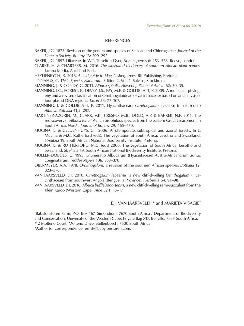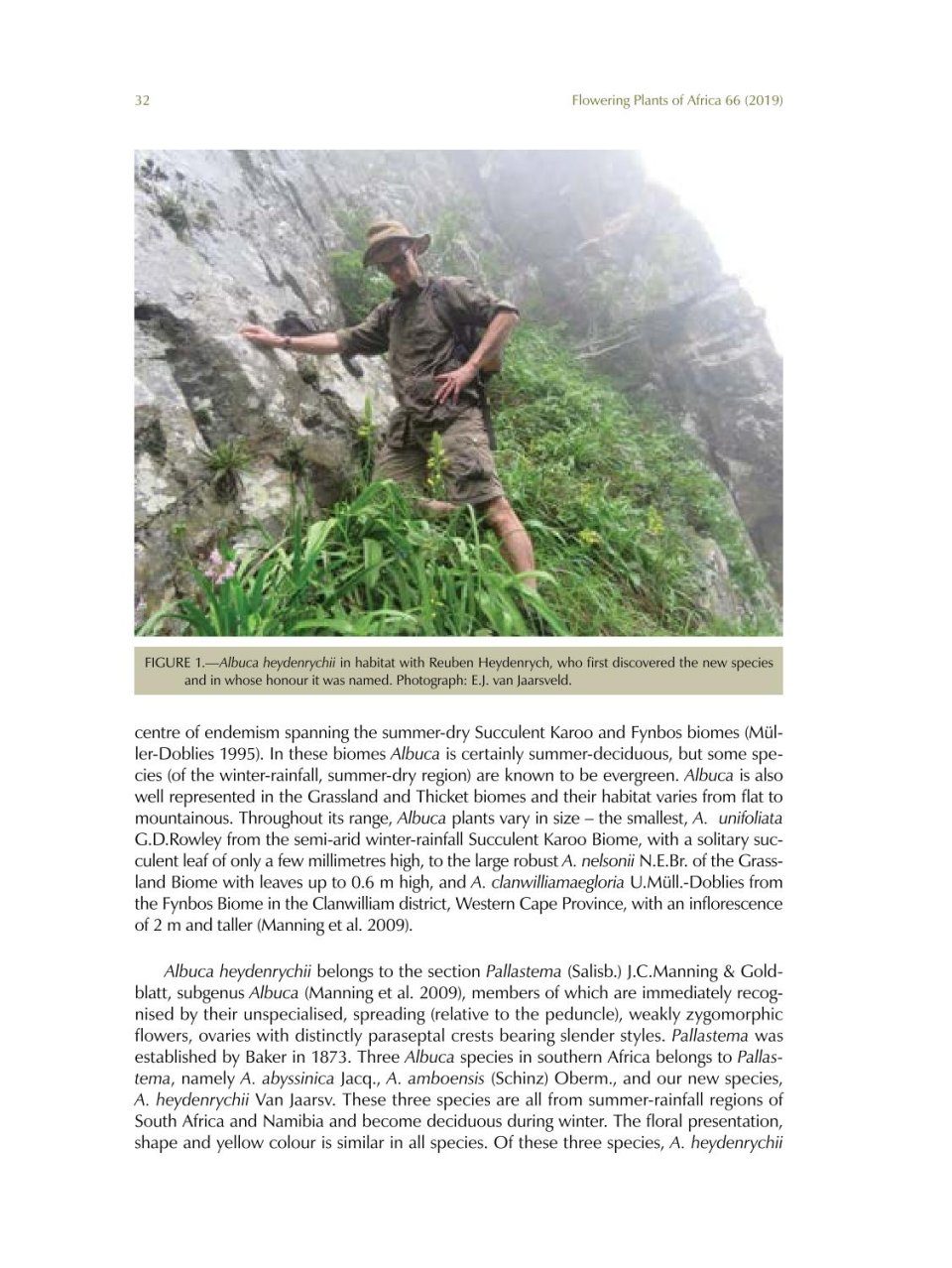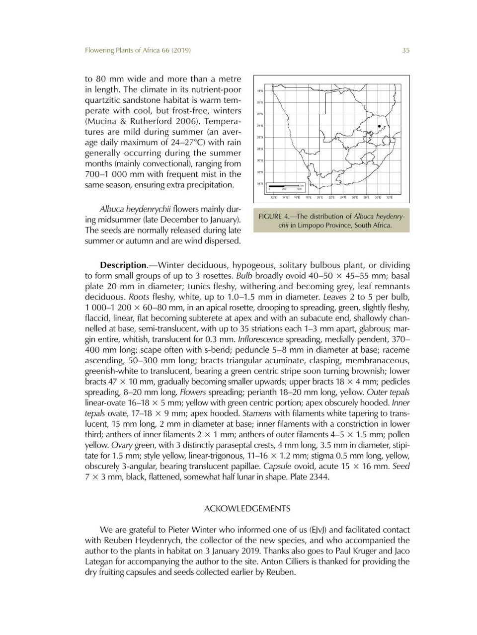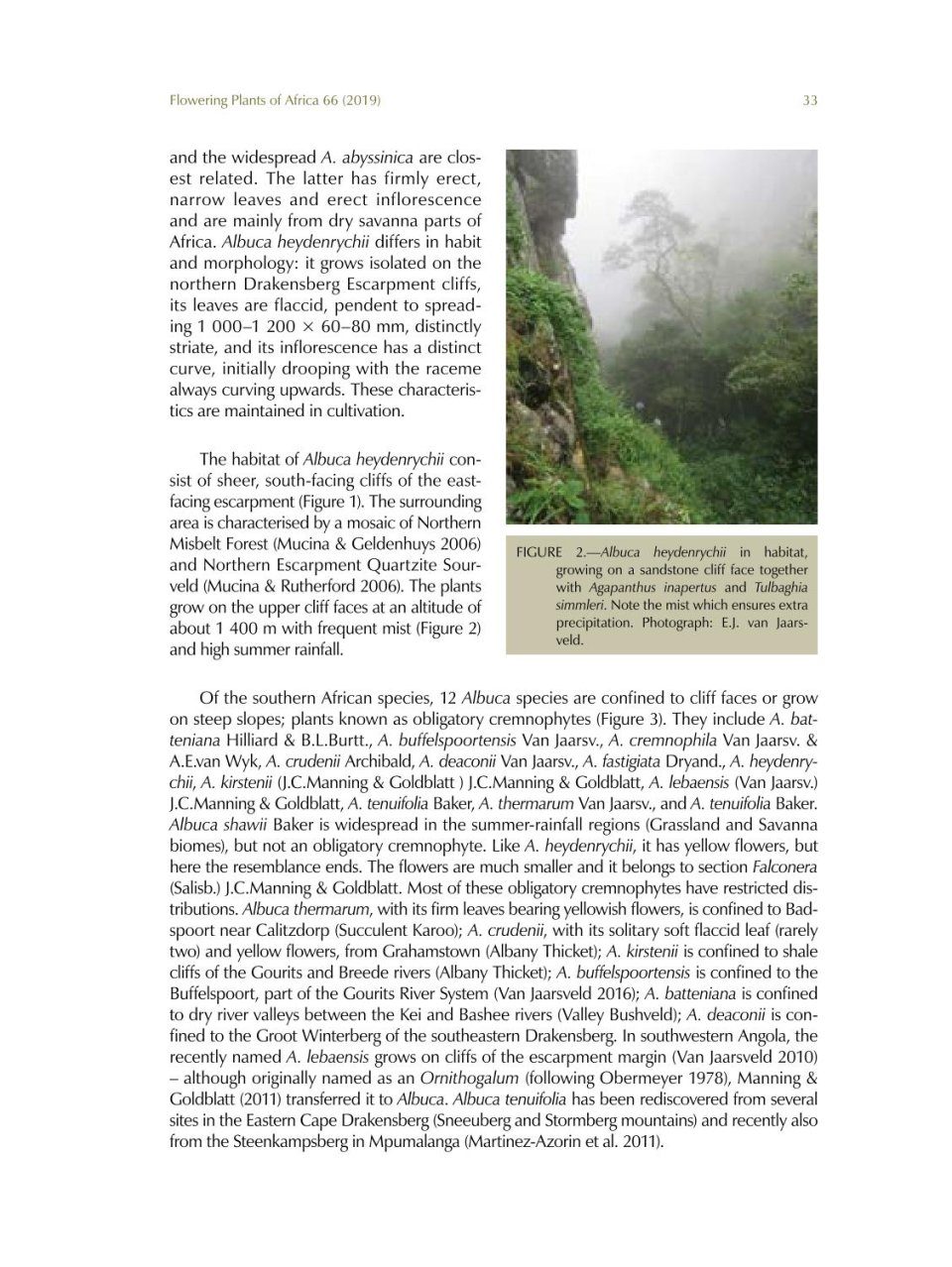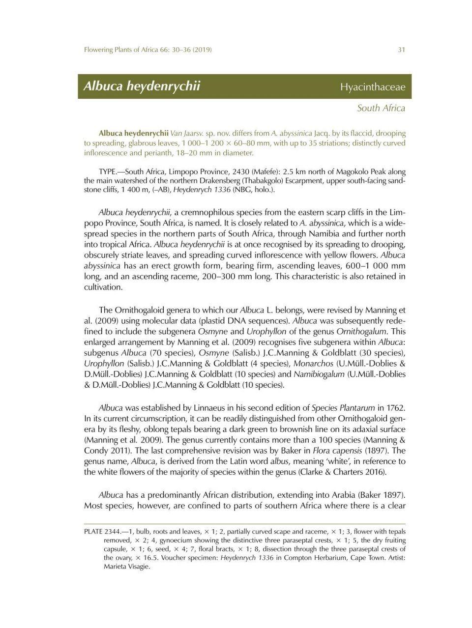 Flowering Plants of Africa is a peer-reviewed biennial series containing colour plates with descriptions of flowering plants of Africa and its neighbouring islands. The journal has become a collector’s item of the African and specifically South African flora. Twenty full colour plates and descriptions of plants appear in volume 66, which is dedicated to Gillian [Gill] Condy, SANBI’s recently retired resident botanical artist, in recognition of her passionate and unsurpassed documentation of indigenous flora. Contributions to this colourful edition include Moraea spathulata, Aloidendron barberae (artwork featured on the cover), Protea parvula, Agathosma adenandriflora, Chironia baccifera and Orbea namaquensis. Five new taxa (Cyrtanthus pondoensis Van Jaarsv., Albuca heydenrychii Van Jaarsv., Eucomis sonnetteana N.R.Crouch, Mart.-Azorín & J.E.Burrows, Acanthopsis pagodiformis H.M.Steyn and Senecio voigtii Van Jaars.) are published in this volume. The botanical art is mainly the work of Gillian Condy; other artists who contributed to this volume are Marieta Visagie, Ellaphie Ward-Hilhorst, Angela Beaumont and Daleen Roodt. A guide for authors and artists, and an index to species are also included.