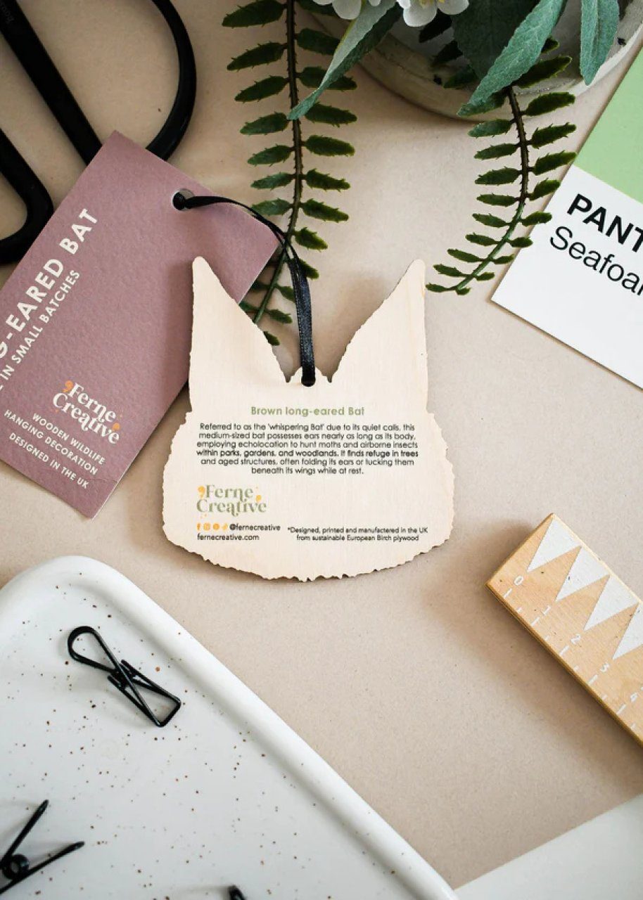 This beautifully illustrated Long-Eared Bat Wooden Hanging Decoration is perfect as a tree ornament or as a unique piece of home decor. Handcrafted from sustainably sourced birch plywood, all wooden decorations have a high-quality printed illustration on one side and fun facts about the species on the reverse. Caring for this ornament is as simple as wiping it down with a dry cloth to keep it looking its best.