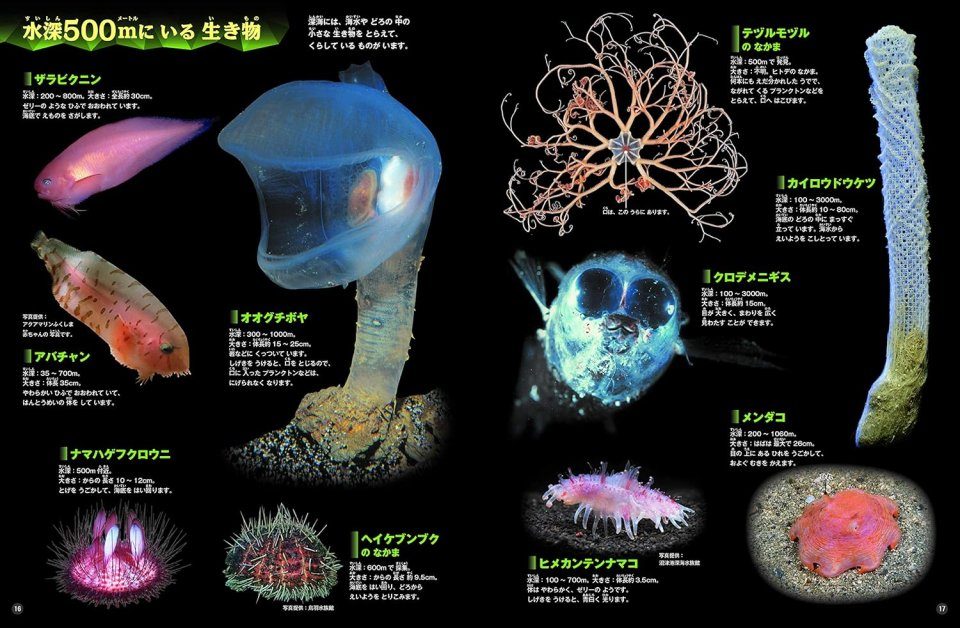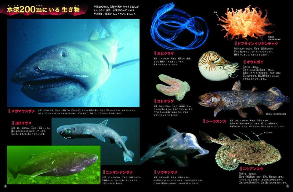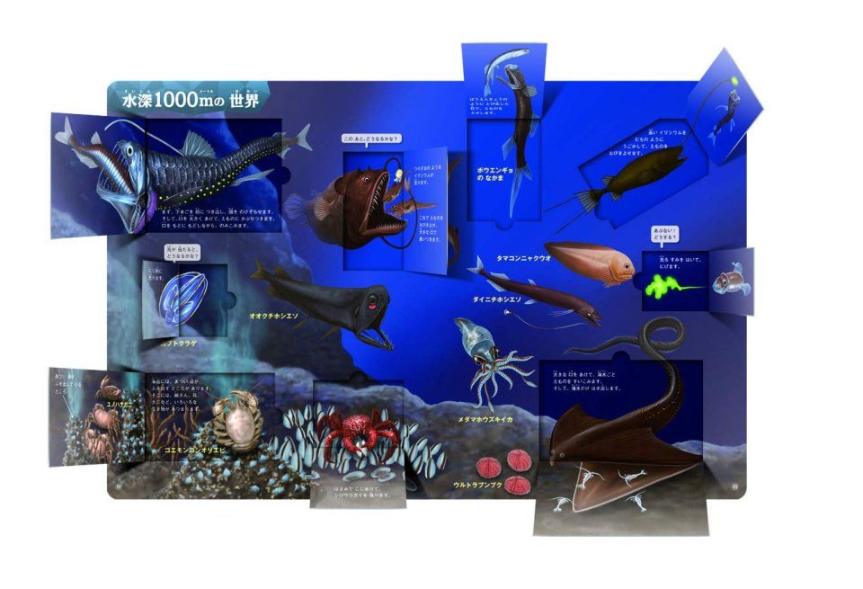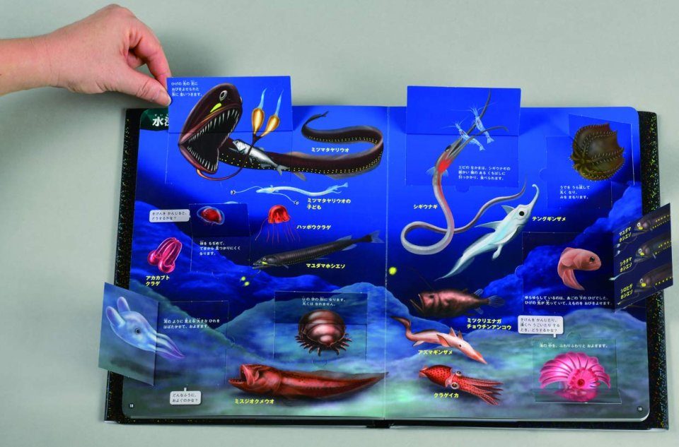This picture book for children has pages full of photos and flaps that hide further details. Discover the wonders of deep-sea creatures. This book features about 150 species of strange deep-sea creatures. The book is structured so that the depths go from 200 m to 10,000m . When you open the flaps, you will see the creatures' bodies light up, luring prey with something like a fishing rod, or spreading their fins wide. This is a fun picture book that shows the secrets of how deep-sea creatures survive in harsh environments. This picture book is full of photos of fantastical and beautiful creatures that have unique appearances and scary faces.