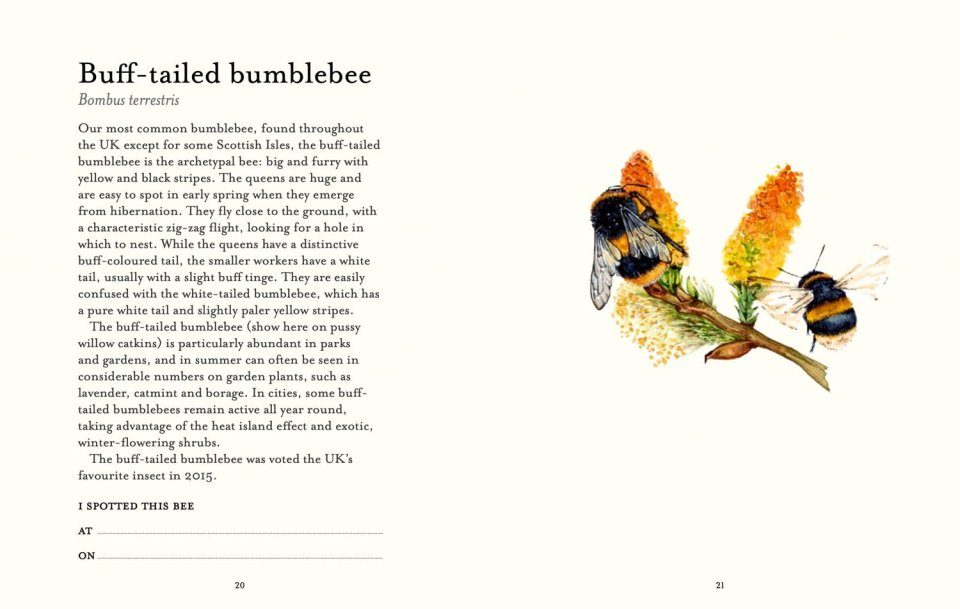 This handy little guide is the perfect way to start the journey. It's beautifully illustrated and has a delightful and thoughtful text by one of Britain's leading bee experts, Dave Goulson, best-selling author of The Garden Jungle. Discover mason bees and mining bees, cuckoo bees and carder bees, even a couple of convincing bee impersonators. Learn to distinguish your white-tailed bumblebee from your buff-tailed bumblebee, your pantaloon bee from your hairy-footed flower bee.