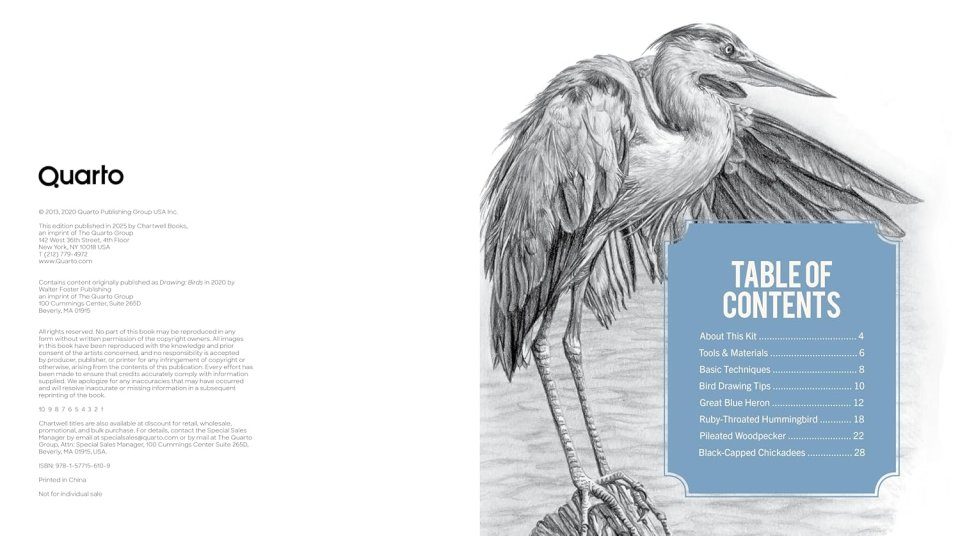 Combine your love for nature and art with this all-in-one kit. Whatever your skill level, and whether you consider yourself an avid birdwatcher or art enthusiast, or simply want to learn more about drawing birds, you will find creative inspiration in The Birder's Drawing and Coloring Kit. Discover helpful drawing tips and easy-to-follow guides with the instruction book, where you'll learn to draw a variety of birds, such as a great blue heron, a ruby-throated hummingbird, and black-capped chickadees. Then, relax your mind with the included colouring pages featuring a variety of charming bird species to make uniquely your own.