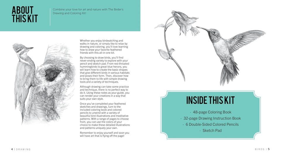 The Birder's Drawing and Coloring Kit Create and Color Beautiful Birds! Includes: Sketch Pad, Drawing Instruction Guide, Coloring Book, Colored Pencils