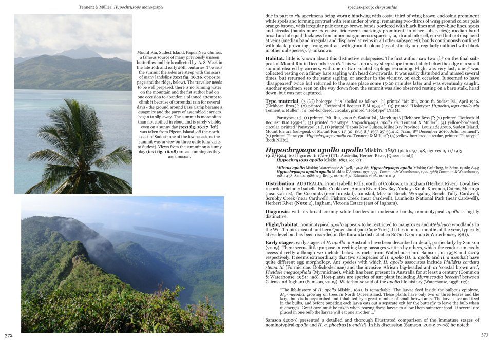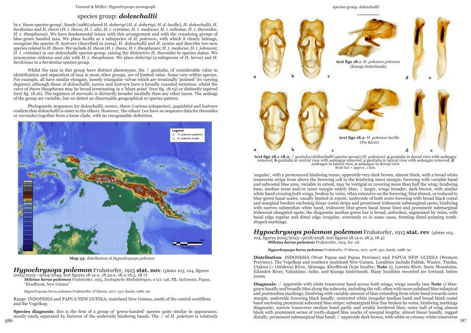 Until recently, some 109 Hypochrysops taxa (57 species: 147 names) were recognised; this modern treatment recognises 159 taxa (93 species: 211 names), with significant new synonymy and description of 21 new species and 30 subspecies. The authors carried out extensive and detailed research over more than two decades, spending many years in the field, and between them have travelled more than 250,000 kilometres in visiting museums, and university and private collections across the world, collaborating with professional and amateur entomologists. Many primary type specimens previously declared lost were located (96% of all 211 primary types and hundreds of secondary types are illustrated) and some complex, long-standing errors and points of confusion in taxonomy, nomenclature and identification in the literature are unravelled in detail.