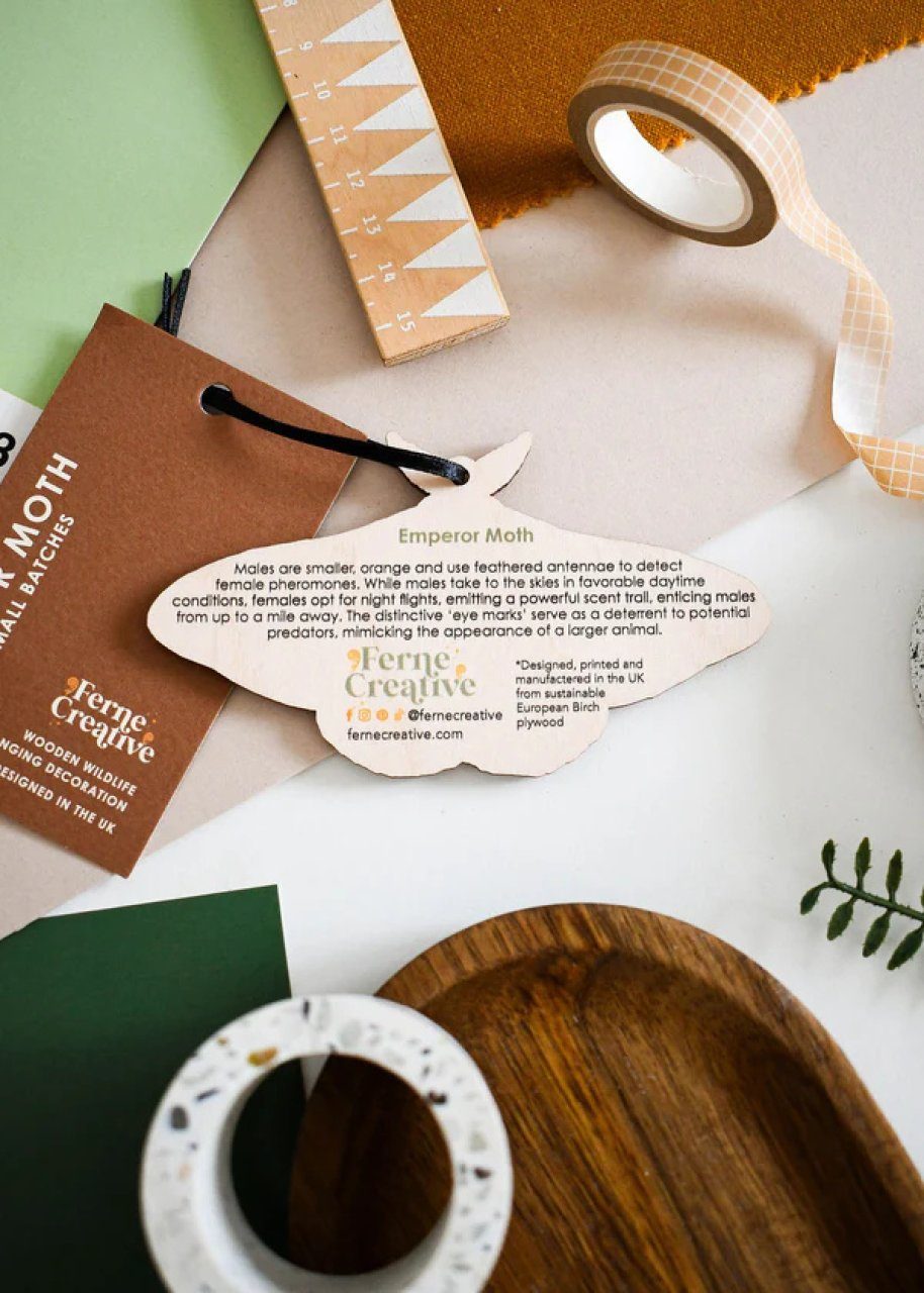 This beautifully illustrated Emperor Moth Wooden Hanging Decoration is perfect as a tree ornament or as a unique piece of home decor. Handcrafted from sustainably sourced birch plywood, all wooden decorations have a high-quality printed illustration on one side and fun facts about the species on the reverse. Caring for this ornament is as simple as wiping it down with a dry cloth to keep it looking its best.