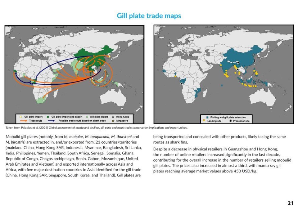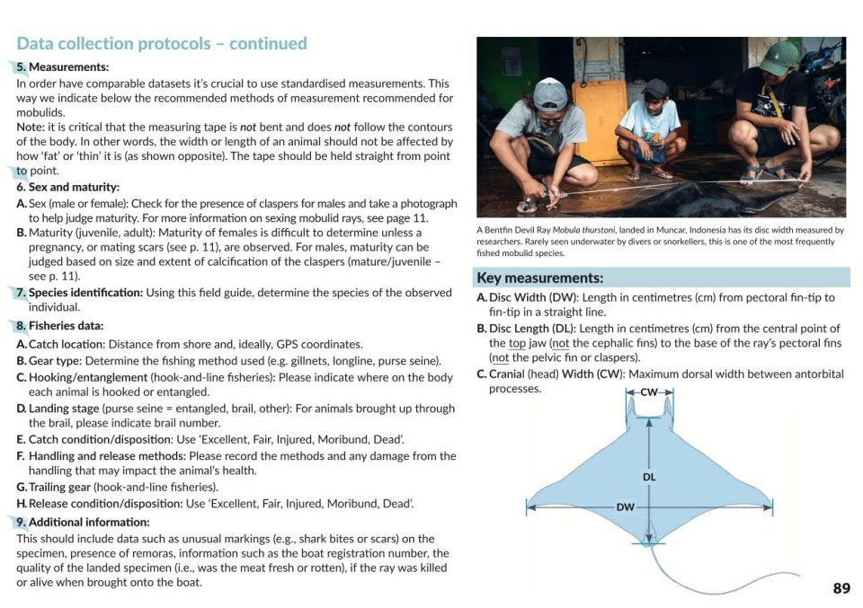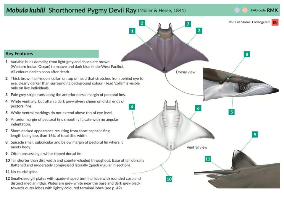 This guide contains over a dozen ways to assist you with the identification of manta and devil rays and the species they associate with, whether in the ocean (alive), at fishery landings sites (dead), within trade (gill plates), or from the air. A new dichotomous key has been created to simplify identification using easy-to-recognise features. The key directs the reader to key identification characteristics, and to further aid and simplify identification, the guide and key colour codes the species by ocean-basin occurrence. Detailed species accounts provide key features, range maps, colour illustrations, behavioural descriptions and underwater imagery for each manta and devil ray species. This guide also provides the tools, guidance, and materials in the form of data collection protocols, codes of conduct, guidelines and more, which we hope will aid the research and conservation management of these threatened rays.