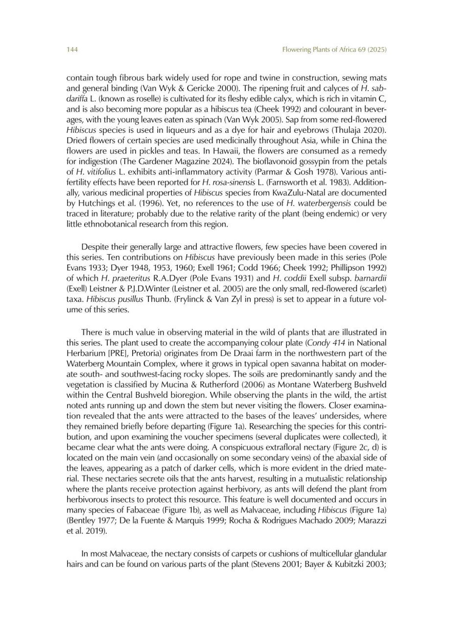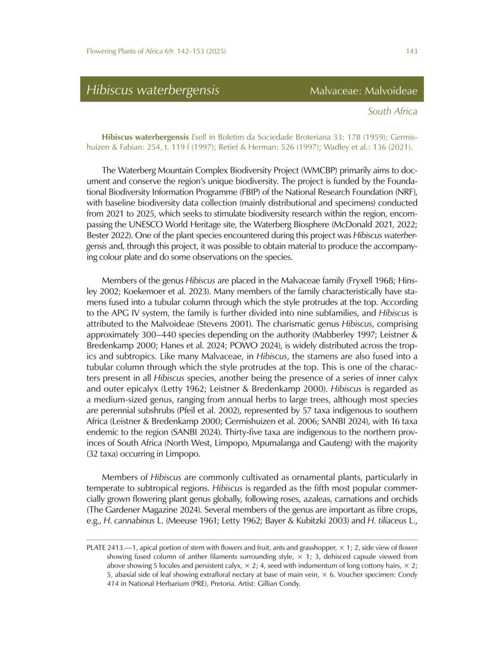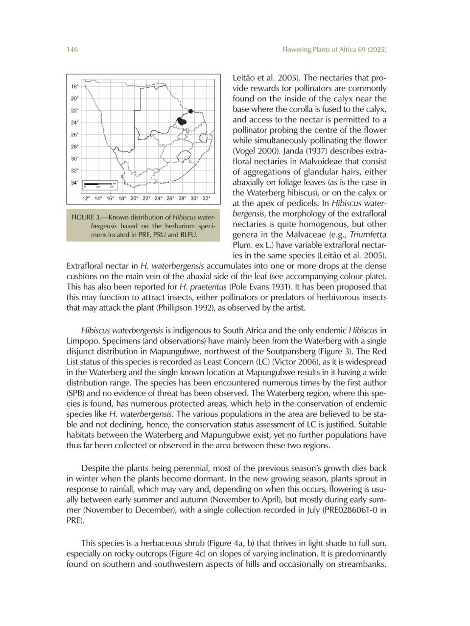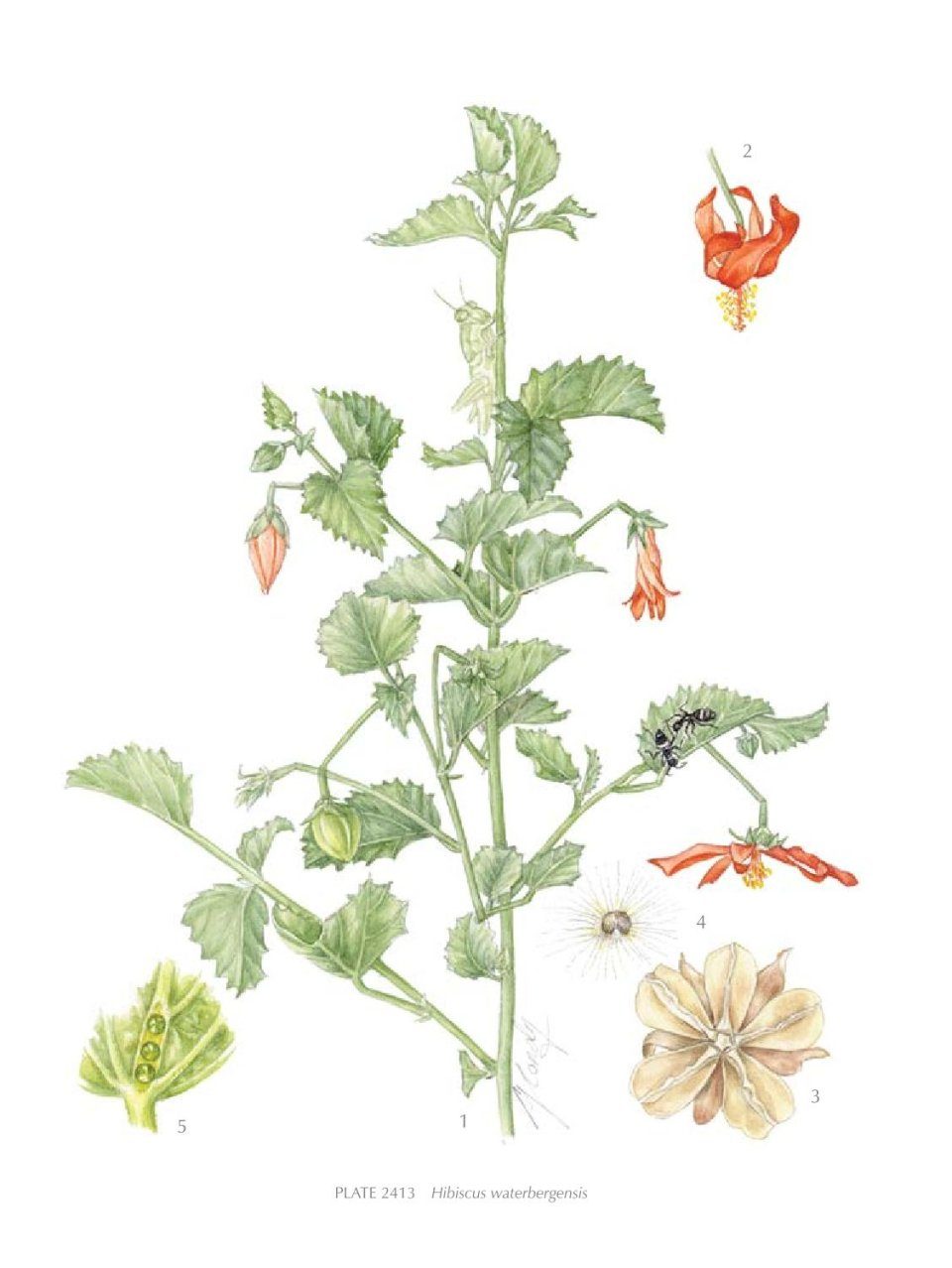Contributions to this colourful edition include the striking Securidaca longepedunculata; seven kalanchoes; Aloe davyana var. magdae, which was illustrated by the artist (Magda Nel) after whom the taxon was named; the minute Streptocarpus decipiens with its enigmatic story of rediscovery after more than half a century; and many more. With an emphasis on the Waterberg region in South Africa, other interesting species featured include Hibiscus waterbergensis, Gloriosa rigodifolia and Thesium celatum – the first ever Thesium species to be featured in FPA.