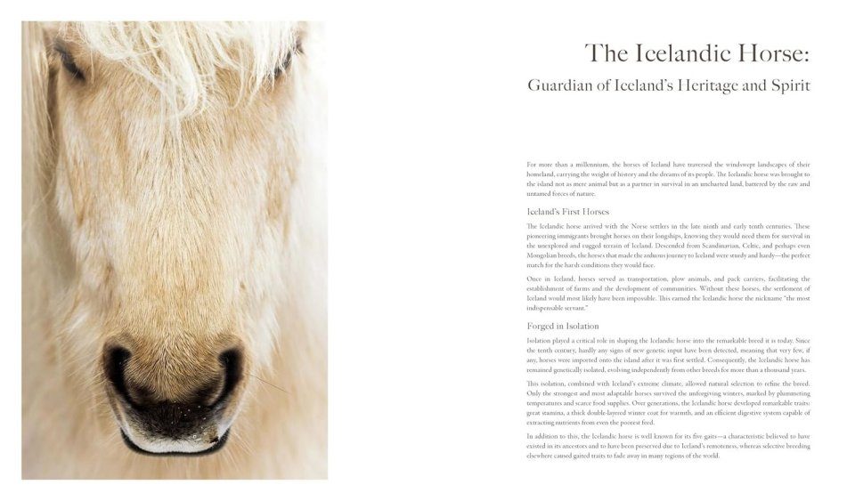 Undertaking a more ambitious production, Laiz collaborated with local horse breeders and with Icelandic photographer, filmmaker, and artist Thrainn Kolbeinsson to capture the magnificent animals in iconic and breathtaking locations – from the famous Skogafoss blanketed with snow to the active Fagradalsfjall volcano; and galloping across beaches, frolicking amid glaciers, and with waterfalls, tundra, and fierce ocean backdrops. Kolbeinsson's powerful drone photography featured throughout the book showcases the aerial perspective of these epic landscapes that have shaped the horses of Iceland.