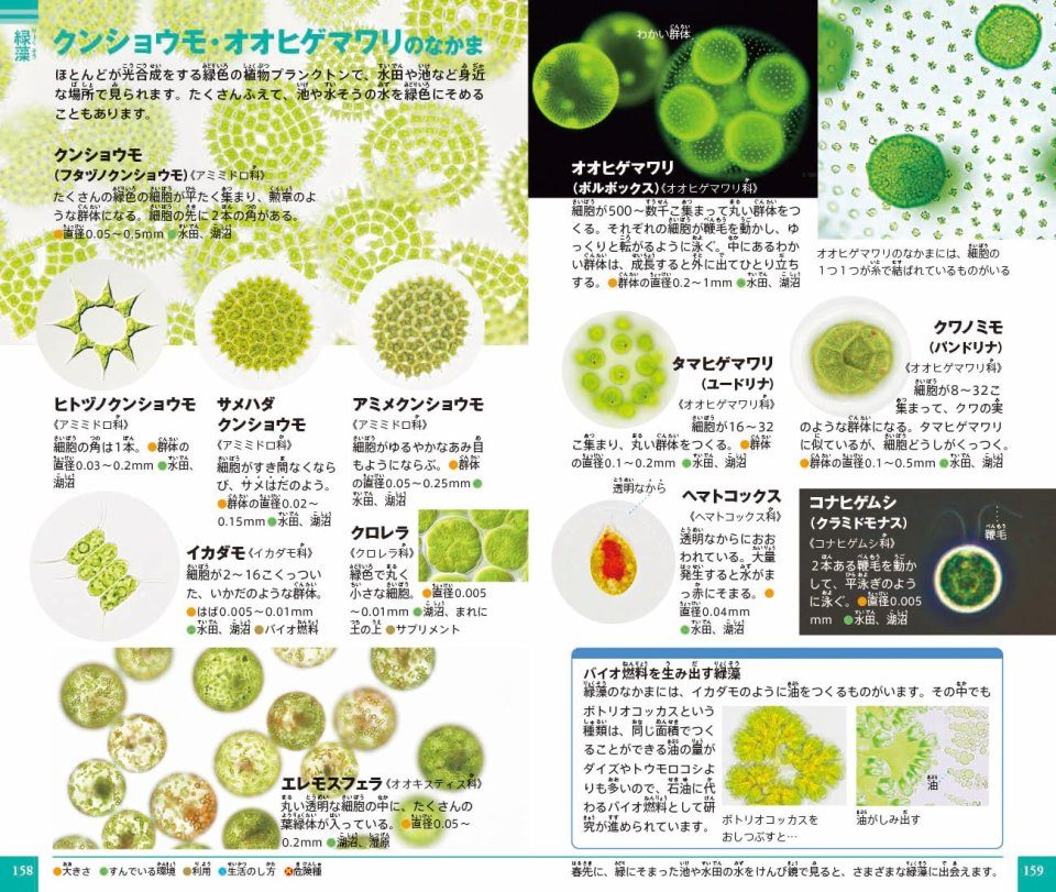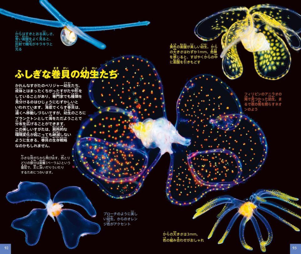 知られざる事実に驚かされる「プランクトンがいなければ地球はめつぼうする?!」、不思議な生態がわかる「新種発見」「光るプランクトン」、また「プランクトンを集めに行こう!」のような自由研究に最適なコーナーまで、幅広い切り口で、読んでいて楽しい大充実の内容です。