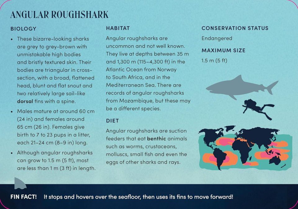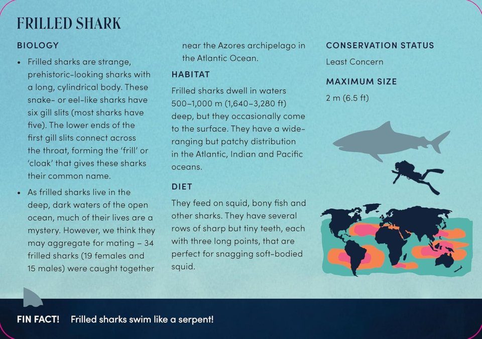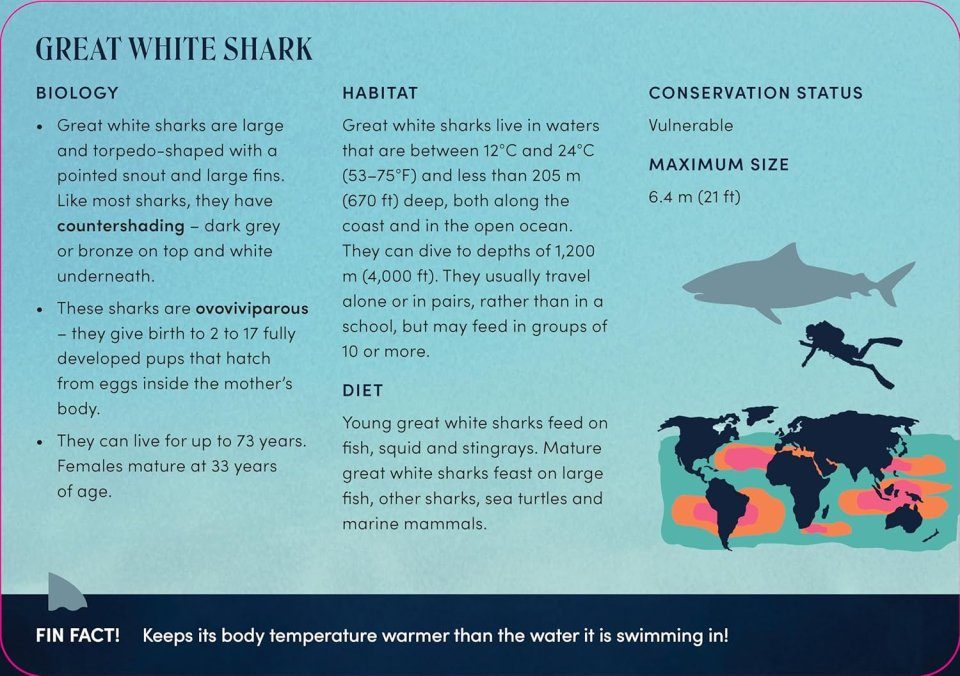 Dive into the deep blue with The Shark Deck, featuring fascinating facts and figures on 50 shark species. From iconic sharks like the great white, tiger and hammerhead, to the lesser-known but equally captivating cookiecutter, wobbegong and goblin sharks, discover information on habitat, diet, conservation status, and maximum size of each fascinating fish.